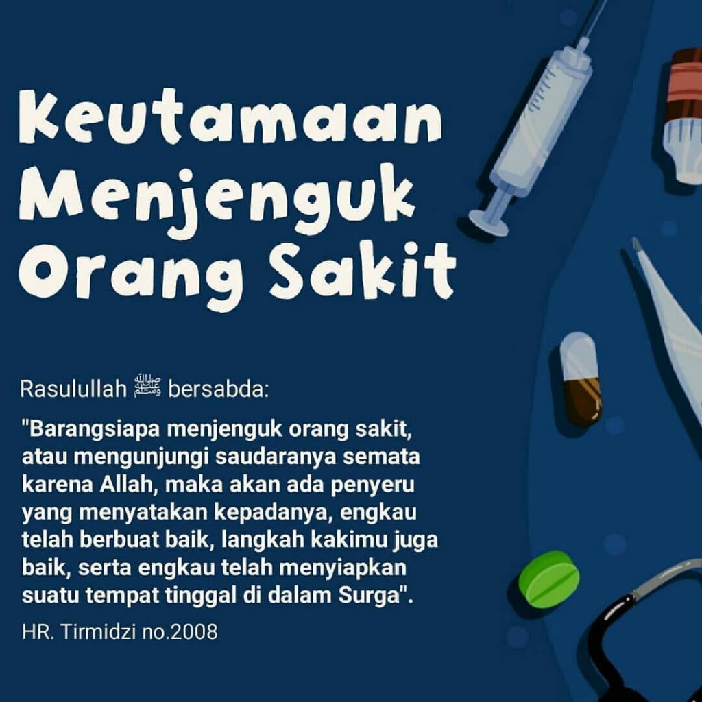 “Barangsiapa menjenguk orang sakit, atau mengunjungi saudaranya semata karena Allah, maka akan ada penyeru yang menyatakan kepadanya, engkau telah berbuat baik, langkah kakimu juga baik, serta engkau telah menyiapkan suatu tempat tinggal di dalam Surga”. [HR. Tirmidzi no. 2008, Ibnu Majah no. 1443, Ahmad no. 8325]