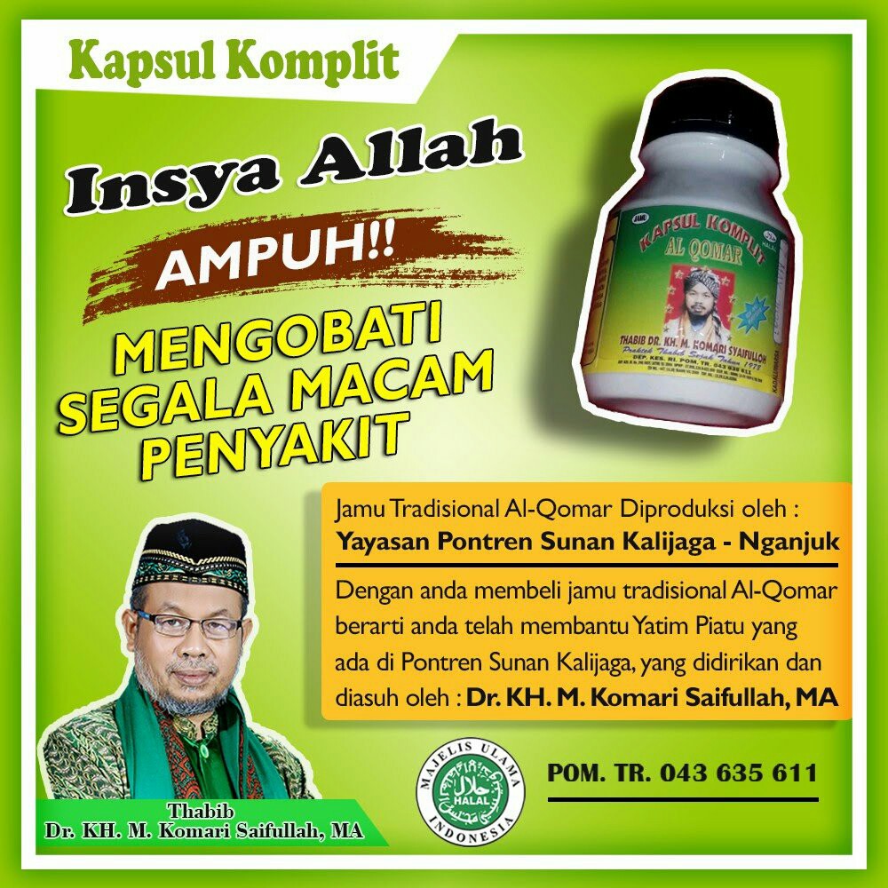 PRODUK HERBAL 100% TANPA EFEK SAMPING HALAL DAN RESMI BADAN POM TR 043 635 611 JANGAN KHAWATIR BELANJA DI TOKO KAMI, INSYAALLAH AMANAH ISI 40 KAPSUL BISA ECER 20 KAPSUL KOMPOSISI : Kaempferiae Rhizoma : 20 % Curcumae Rhizoma : 15 % Curcumae Aeginose Rhizoma : 15 % Amomi Fructus : 15 % Retrofacti Fructus : 15 %; dan Lai-lain : 20 % MANFAAT DAN KHASIAT KAPSUL KOMPLIT AL-QOMAR : insya Allah sangat berguna sekali untuk mencegah dan mengobati berbagai macam penyakit antara lain : Kanker, Tumor, Lever, Lemah Syahwat, Ginjal, Kencing Batu, Kencing Darah/Nanah, Kencing Manis, darah Tinggi, Lumpuh, Keseleo, Salah Urat, Rheumatik/Flu Tulang, , Sakit Gigi, Masuk angin, Kembung, Batuk, Gatal-gatal, Kecapekan, Jantung, Paru-paru, Hernia, Sakit Kepala, Anemia, Amandel, Radang Tenggorokan, dan semua jenis penyakit bisa dicoba. * Mengusir Ambeien/Wasir * Mengobati patah tulang, Syaraf Kejepit * Menyembuhkan Luka dan Penyakit Diabetes * Mengobati Tumor, Kanker, Miom dan Kista * Mengobati penyakit stroke, jantung, & liver * Menurunkan Kolesterol & Takanan darah tinggi * Mengobati Penyakit yang Menyerang Ternggorokan – Amandel – Faringitis – Radang Tenggorokan – Tenggorokan Sakit – Tenggorokan Gatal – Tenggorokan Serak – Batuk Berdahak – Batuk Nyeri – Batuk Kering – dan Penyakit Tenggorokan lainnya * Mengobati Penyakit Lambung – Asam Lambung Tinggi – Sakit Maag – Sesak Nafas – Maag Akut Kronis – Gastritis – Gerd – Infeksi Luka Radang – Asam Lambung Kronis * Mengobati Penyakit Sendi – Asam Urat – Kolesterol Tinggi – Sakit Reumatik – Pengapuran Tulang – Kaki Bengkak – Kaki Kesemutan – Tangan Kebas – Mati Rasa – Nyeri Sendi – Sendi Kaku – Radang Sendi – Cedera Otot – Otot Sensitif yang Menyebar (Fibromialgia) * Mengobati Penyakit Pernafasan – Ispa – Asma – Bronkitis – Sesak Nafas – TBC Kelenjar – Tuberkulosis – Batuk Bronchitis – Kanker Paru – Paru – Pembersih Paru Paru (Pneumonia) – Nyeri Dada Sebelah Kanan Kiri – Infeksi Radang Paru Paru Basah * Mengobati Penyakit Ginjal & Empedu – Penghancur Batu Empedu – Batu Ginjal – Gagal Ginjal – Kista Ginjal – Sakit Ginjal – Infeksi Ginjal – Ginjal polikistik – Gagal Ginjal Akut – Ginjal Kronis – Batu Empedu ATURAN MINUM (SESUDAH MAKAN) : Dewasa : Sehari 3 x 2 Kapsul Anak-anak : Sehari 3 x 1 Kapsul NOTE : UNTUK PEMBELIAN LUAR PULAU JAWA HARGA 2X LIPAT (Mohon untuk memilih variasi luar jawa) Semoga atas izin Allah SWT setiap pembelian produk jamu Herbal Tradisional Al-Qomar Online di berikan kesembuhan dan dapat merasakan khasiat terbaik dari setiap penggunaan produknya, Amiin.. “CARI YANG ASLI JANGAN ILEGAL PASTIKAN ADA IZIN BADAN POM” ~HAPPY SHOPPING~